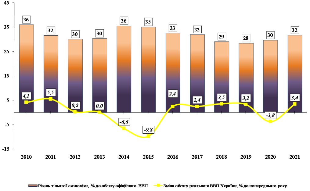 З початком повномасштабного вторгнення Мінекономіки припинило публікацію щоквартальних звітів щодо обсягу тіньової економіки в Україні. Однак збереглися дані за роки до повномасштабного вторгнення, згідно з якими частка тіньової економіки в Україні протягом 10 років коливалася на рівні 32-36%. Це, безумовно, високий рівень, який шкодить бюджету та довгостроковим економічним цілям країни, однак не катастрофічний.