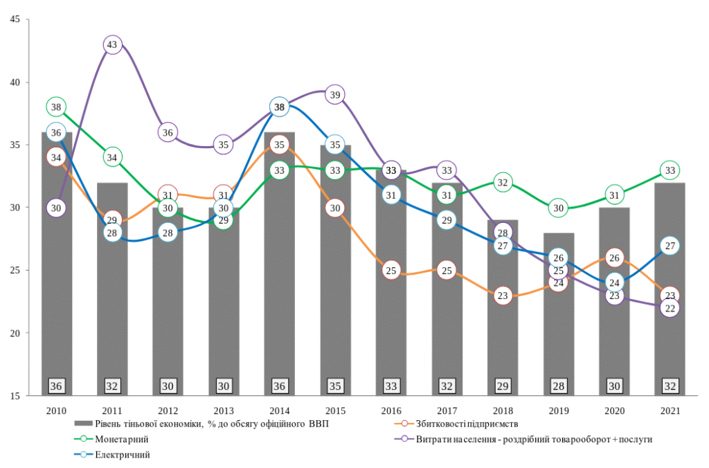 Усі методи дослідження тіньової економіки можна поділити на два види: прямі (мікроекономічні) – безпосереднє збирання інформації через анкетні опитування або експертні оцінки та непрямі (макроекономічні) – аналіз макроекономічної статистики. Останні цікавлять нас найбільше. Найпопулярнішим вважається метод зіставлення двох показників ВВП, розрахованих за доходами та видатками відповідно: якщо видатковий ВВП перевищує дохідний, різниця інтерпретується як частка економіки в тіні. Недоліком є те, що цей метод не враховує зміни в моделі споживання, що може бути проблемою при аналізі тіньової економіки України по повномасштабному вторгненню. Операційний метод передбачає аналіз обсягу фінансових операцій у країні та співвідношення між загальною кількістю транзакцій і офіційним ВВП. В основі методу лежить припущення, за яким зі зростанням тіньової економіки кількість фінансових операцій має збільшуватися швидше, ніж офіційний ВВП. Однак, фінансові операції можуть зростати також через цифровізацію платежів і розвиток банківської системи. Монетарний метод застосовується на базі ідеї про те, що в тіньовій економіці основним засобом розрахунку є готівка – у цьому методі підвищення співвідношення між готівкою та депозитами без очевидних макроекономічних причин сприймається як зростання тіньового сектору. Основним недоліком цього методу є припущення про однакову швидкість обігу грошей у легальному й нелегальному секторах. Так званий електричний метод аналізує кореляції між рівнем споживання електроенергії та офіційним ВВП. Логіка: якщо офіційний ВВП демонструє повільніші темпи зростання порівняно зі споживанням електроенергії, то різниця може свідчити про розвиток тіньового виробництва – що навряд-чи витримує випробування контекстом України – бо метод не враховує ситуацію зниження споживання електроенергії, спровокованого атаками на енергетичну інфраструктуру, навіть за умови зростання економіки.