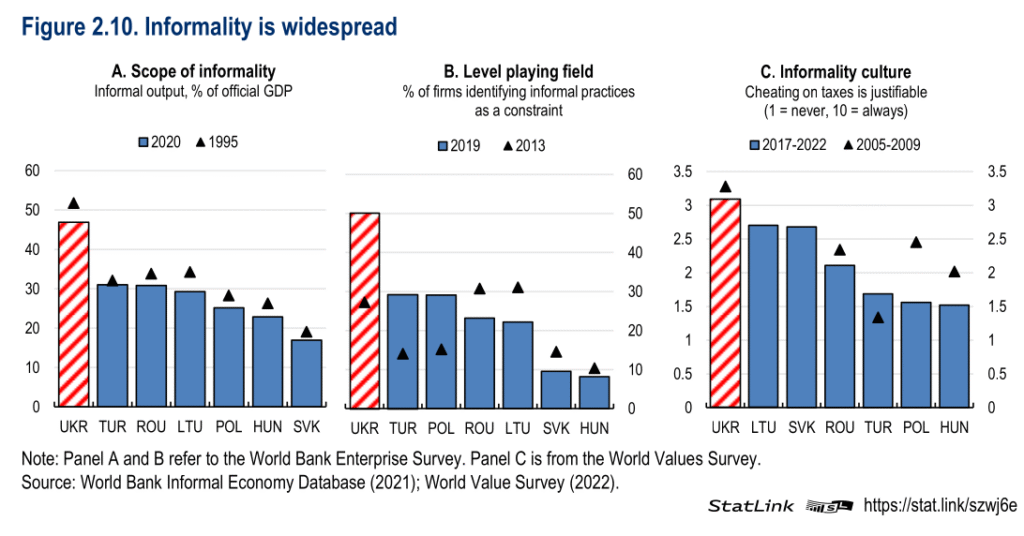 Організація економічного співробітництва і розвитку називає слабкість інституцій, неефективне державне управління, високий фіскальний тягар і непослідовне правозастосування. Це правда, але вона покриває лише частину джерел проблеми, оскільки міжнародні економічні установи такого рівня спираються при оцінці нашої економіки не просто на загальні механізми економічної теорії, а часто навіть на ті, що реалізуються в успішних розвинених економіках або таких, що близькі за рівнем розвитку до української, але зовсім не подібні структурно. Брак контексту та заглиблення є основним недоліком не лише звітів, які складаються такими установами, а часто навіть дорожніх мап, націлених на вирішення проблеми, як-от наприклад свіжа Стратегія національних доходів, щорічний звіт якої ми маємо побачити вдруге наступного січня. В цьому полягає перевага українських дослідників економіки: наприклад, Кундицький та Сенишин пропонують відповіді, які точніше відтворюють український історичний контекст, а саме недосконалий процес роздержавлення та хаотичну приватизацію державного сектору, які призвели до нерівномірного розподілу активів і створення привілейованих економічних груп. Лейфура вважає, що реформи, орієнтовані переважно на короткострокові фіскальні цілі, спричинили дисфункцію податкової системи, яка підвищує податковий тиск на бізнес і спричинює ухилення від оподаткування. Це, на нашу думку, є цілком логічними «рефлексами» економіки після виходу з тоталітарного, зокрема економічно, СРСР, які повніше відтворюють контекст економічної поведінки українського суспільства, а отже наближають до формування коректних стратегій подолання тіні.